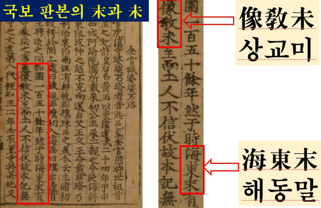 그래서 국보인 '삼국유사' '규장각본(1512년)'과 보물인 '고려대학교 소장본'을 살펴보니 모두 '해동말'로 되어 있었다. 이 경우 해석은 "그래서 이때 해동의 끝에 절을 세우고 불법을 받들었다"는 것이 되니 완전히 다르다. 목판본은 장인이 한 자 한 자 정성 드려 새기기 때문에 두 판본이 모두 오자가 날 가능성은 그리 크지 않다. 국보와 보물 삼국유사가 모두 '해동말(海東末)'로 되어 있다.